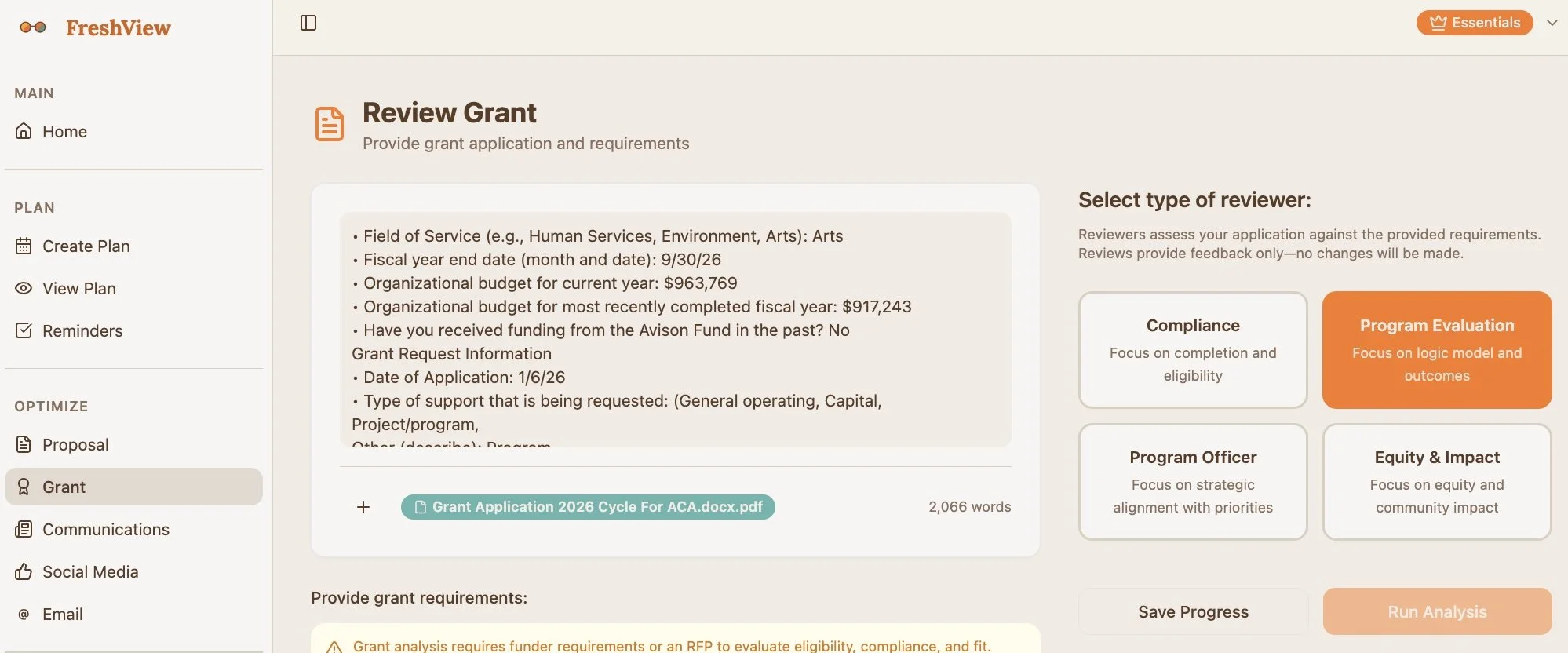 • Ideal for the do-it-all nonprofit professional. FreshView Essentials gives a single user access to our planning tool, draft assistance and content analyzer. You’ll also get three content revisions per day to help hone your communications.