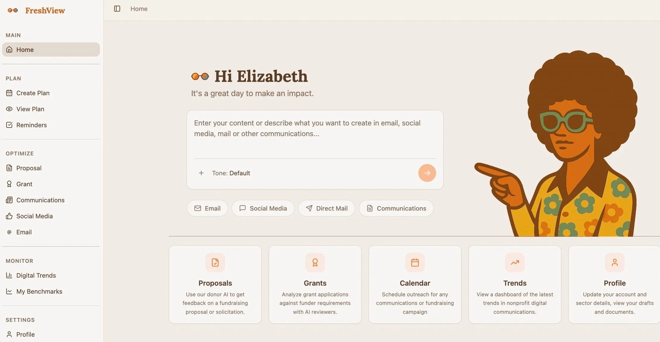 Polish a proposal. Plan a campaign. Draft a social post. Whatever the task, FreshView helps causes communicate better. Not a generic AI tool, FreshView is powered by 15 years of nonprofit data and a real-time content library. We ensure your content has the tone and structure to advance your mission.