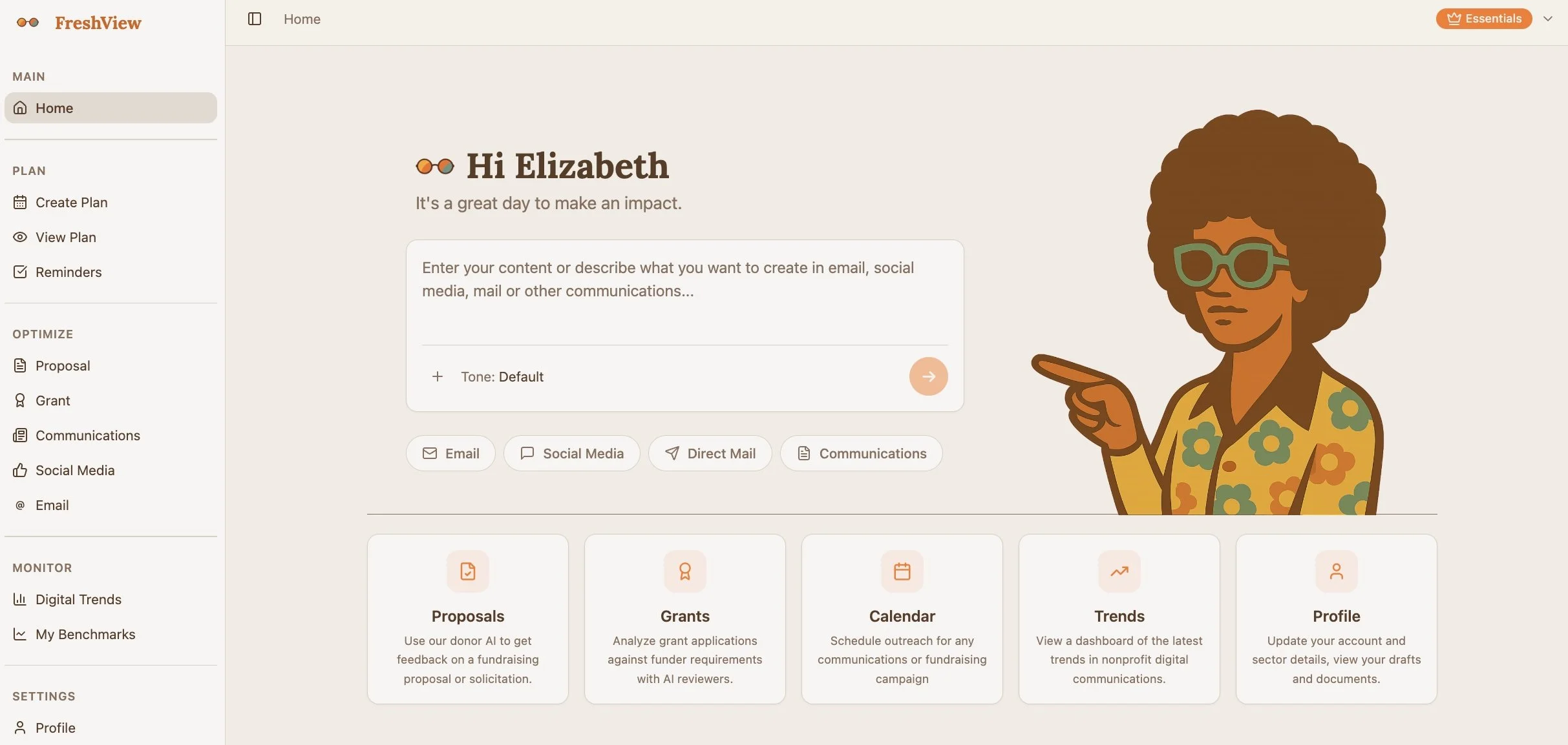 FreshView is the first AI platform dedicated to nonprofit communications and fundraising. Backed by a real-time content library and more than 15 years of benchmarks, donor research and nonprofit data - FreshView gives you the tools to plan and execute your fundraising and communications online and offline.